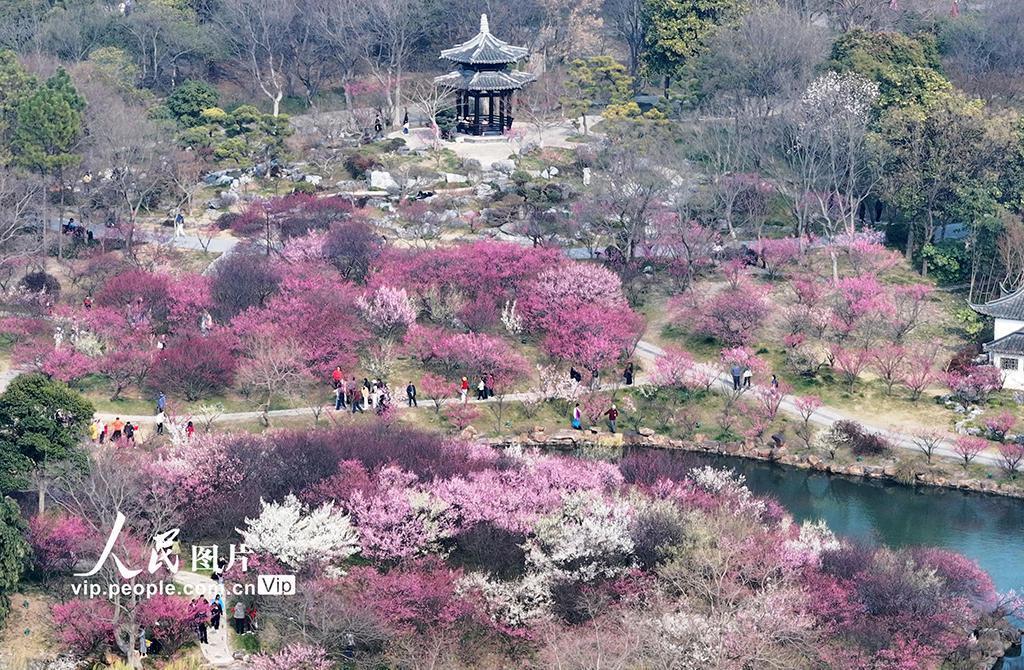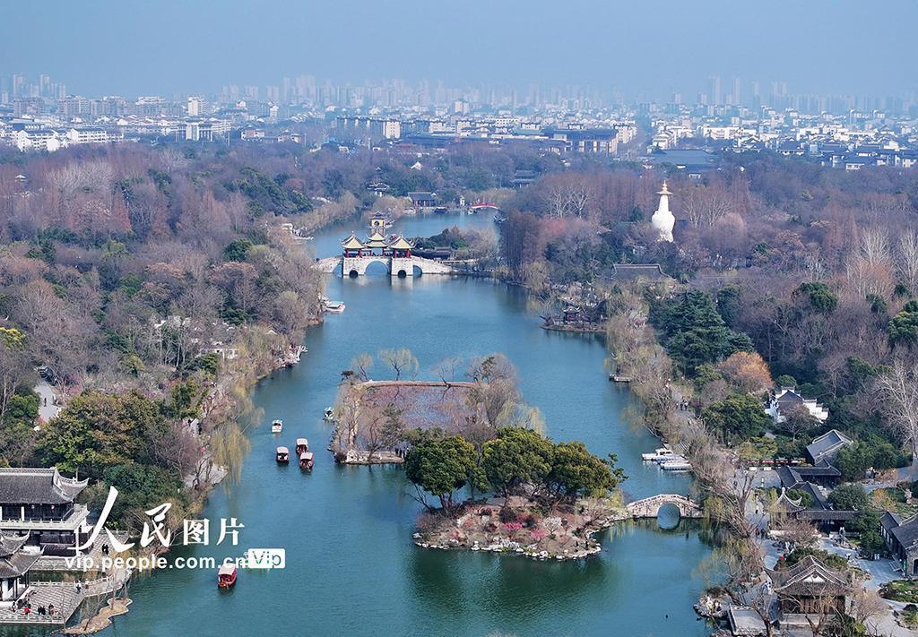 早春时节, 天气逐渐转暖,江苏扬州的瘦西湖风景区春意盎然,红梅竞相绽放,柳芽嫩绿新绽,共同编织出一幅美丽的春日画卷。孟德龙摄(人民图片网)